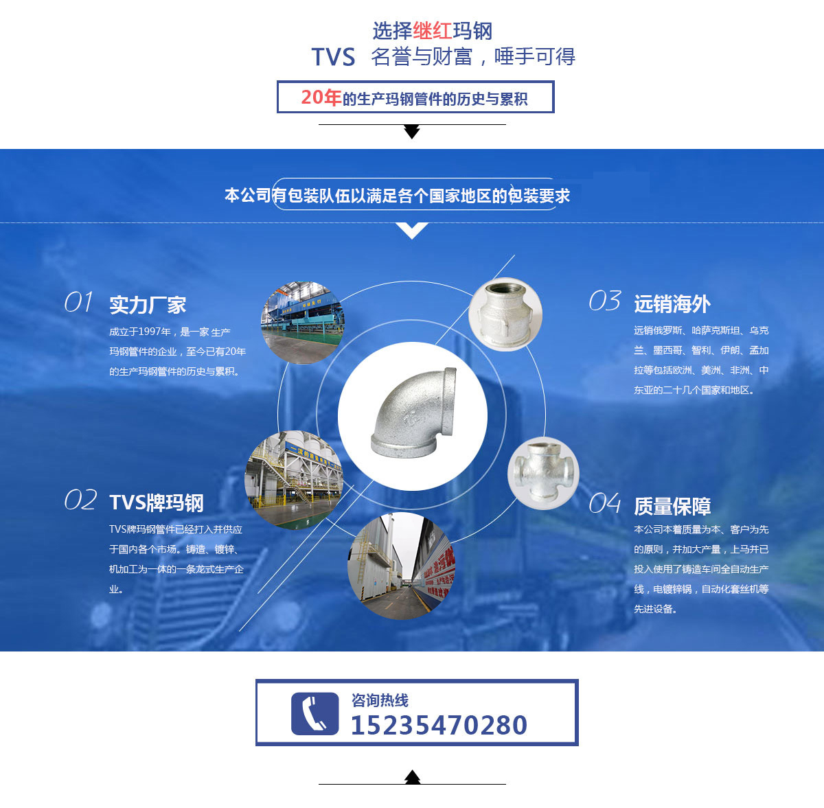 近幾年來,本公司亦開始涉足國(guó)內(nèi)瑪鋼管件的生產(chǎn)和銷售。TVS牌瑪鋼管件已經(jīng)打入并供應(yīng)于國(guó)內(nèi)各個(gè)市場(chǎng)。