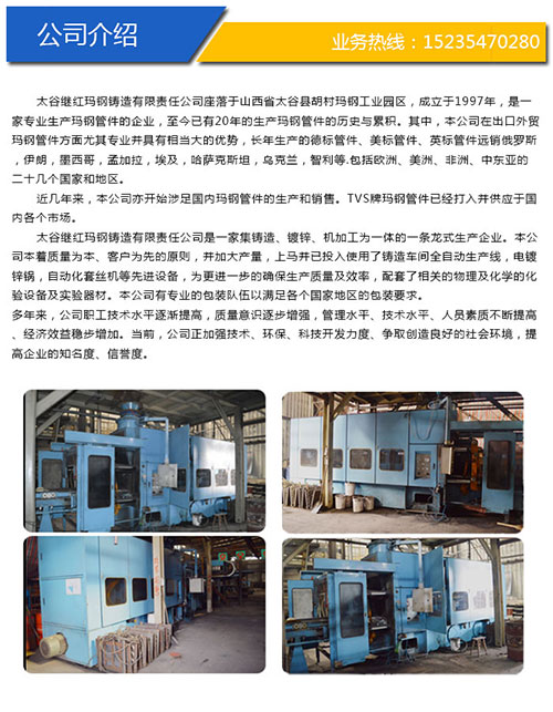 太谷繼紅瑪鋼鑄造有限公司是一家專業生產瑪鋼管件的企業,至今已有20年的生產瑪鋼管件的歷史與累積。本公司在出口外貿瑪鋼管件方面尤其專業并具有相當大的優勢,長年生產的德標管件美標管件、英標管件遠銷俄羅斯,伊朗,墨西哥,孟加拉,埃及,哈薩克斯坦,烏克蘭,智利等.包括歐洲、美洲、非洲、中東亞的二十幾個國家和地區。